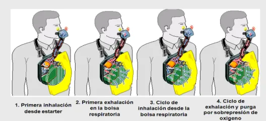 La reacción química se produce de la siguiente manera: el gas exhalado a través de la boquilla entra en contacto con el agente generador de oxígeno presente en el recipiente de los productos químicos. Al respirar, el vapor de agua y el dióxido de carbono (CO₂) exhalados reaccionan con el peróxido de potasio (KO₂), generando oxígeno químico, que luego ingresa en la bolsa de respiración a través del recipiente de los productos químicos.
